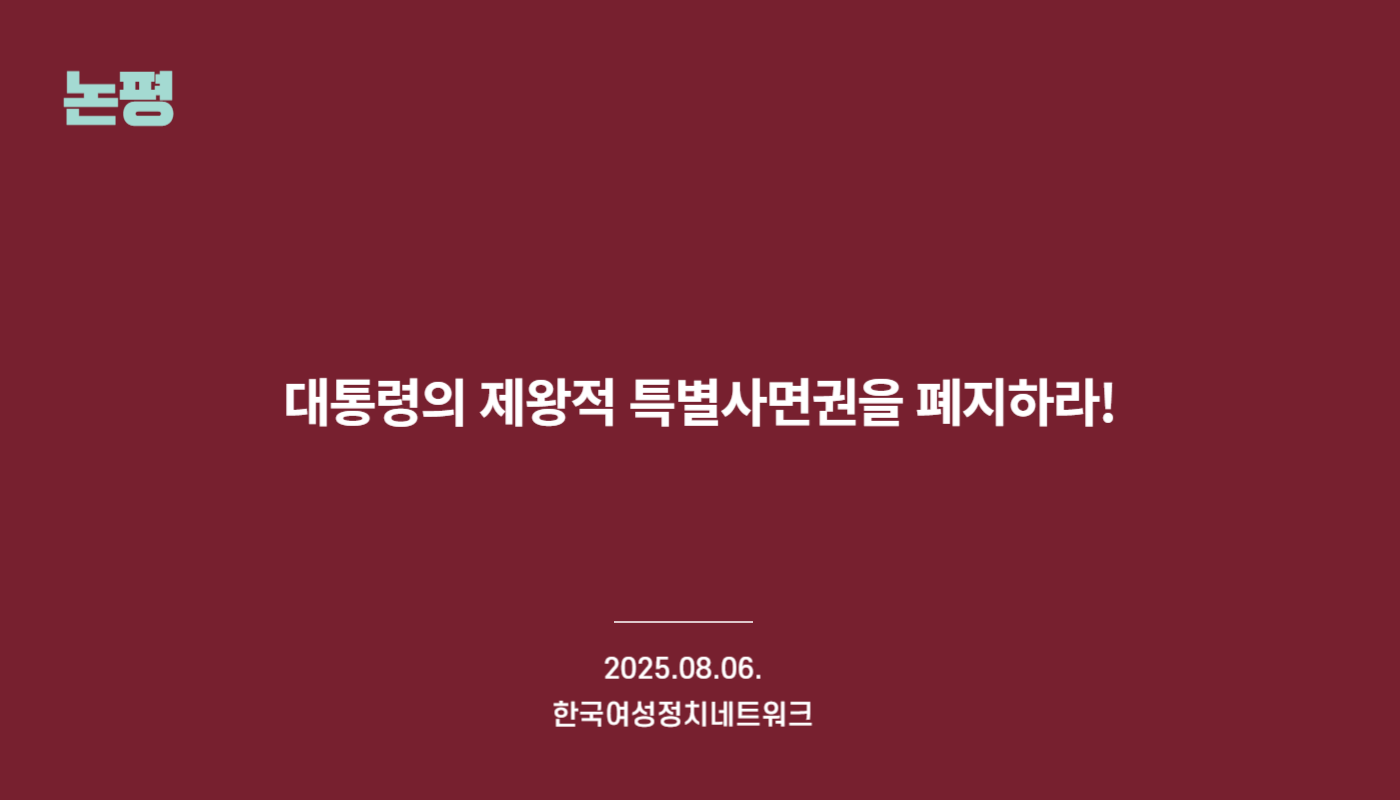 한국여성정치네트워크는 국회에 대통령의 제왕적 특별사면권 폐지를 위한 입법적 조치를 강력히 촉구한다.