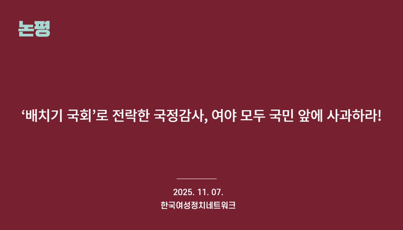 한국여성정치네트워크는 국정감사를 정쟁의 각축장으로 만든 국회를 강력히 규탄한다. 국정감사는 헌법이 보장한 국회의 기본 권한이자, 국민을 대신해 행정부를 감시하는 절차다. 그럼에도 불구하고 대통령실 김현지 실장이 명확한 사유 없이 국감 출석을 회피한 것은 헌법 정신을 훼손한 행위이며, 이를 방조하고 옹호한 더불어민주당의 태도 또한 비판받아 마땅하다.
